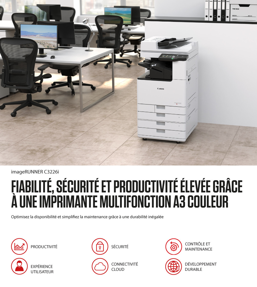 Le modèle Canon imageRUNNER C3226i a été pensé pour la fiabilité. Impression et numérisation de haute qualité intégrées à des flux documentaires très efficaces, avec une sécurité renforcée pour protéger les périphériques, les données et les réseaux.