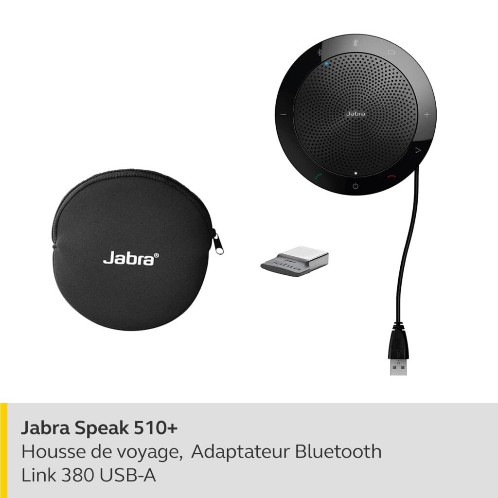 - Contenu de la livraison : 1x Jabra Speak 510+, adaptateur USB Bluetooth Jabra Link 380, batterie lithium-ion incluse, housse de transport du haut-parleur, dépliant Quick Start Guide – 120 mm de diamètre et 33 mm de hauteur, Couleur : noir