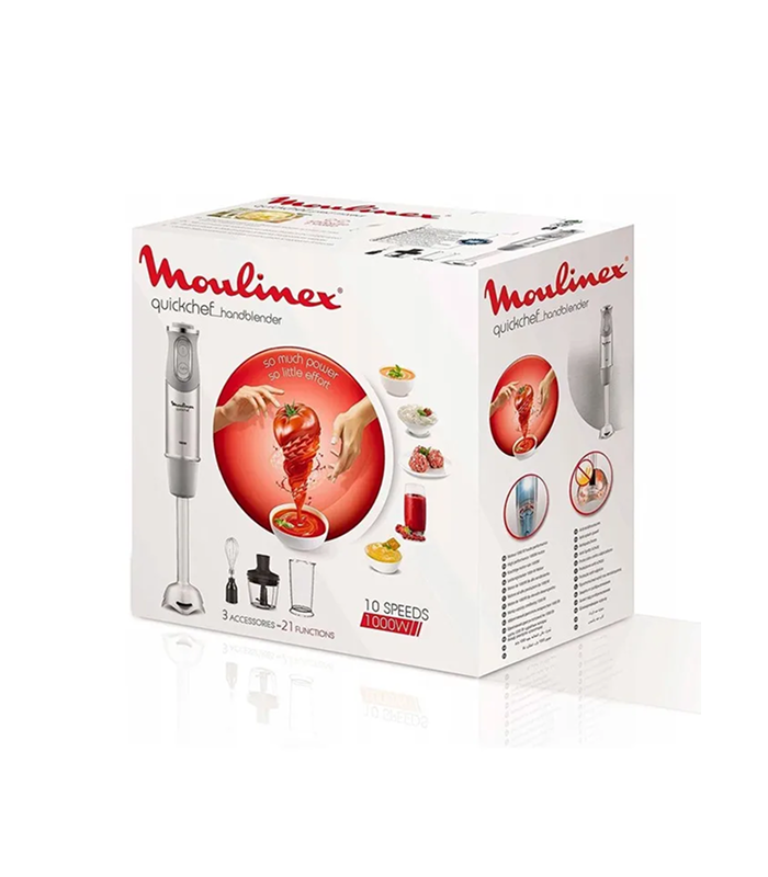 Ce modèle est livré avec un hachoir, un fouet et un verre doseur, vous permettant de hacher, fouetter ou mixer vos préparations avec précision. Idéal pour les soupes, purées, smoothies, sauces, chantilly ou encore les préparations bébé.